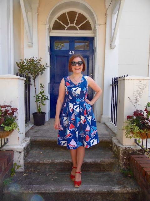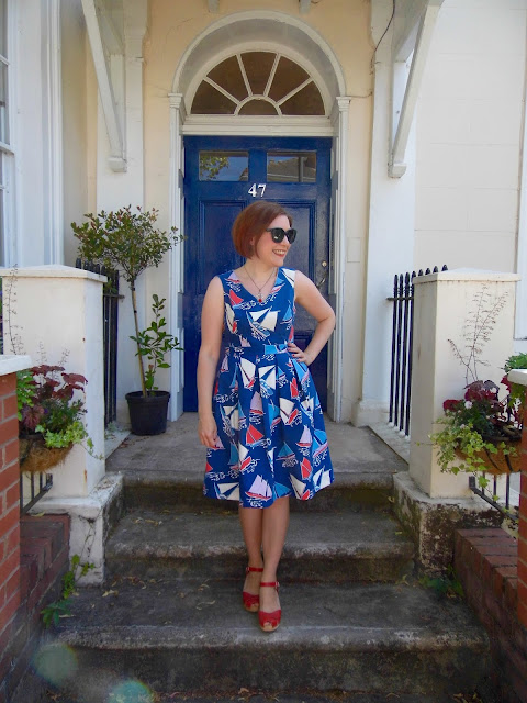 I wish I could think of more to say about this dress, but I am a bit stuck for words! Apart from the annoying waistband thing, it was very straightforward to sew and I have worn it lots. Obviously I love the print - I am still not over my love of all things nautical - and, having avoided patterns with set-in waistbands for ages, I am delighted to have found a pattern that works on me. I also really like the v-neck, which is just the right shape for me!