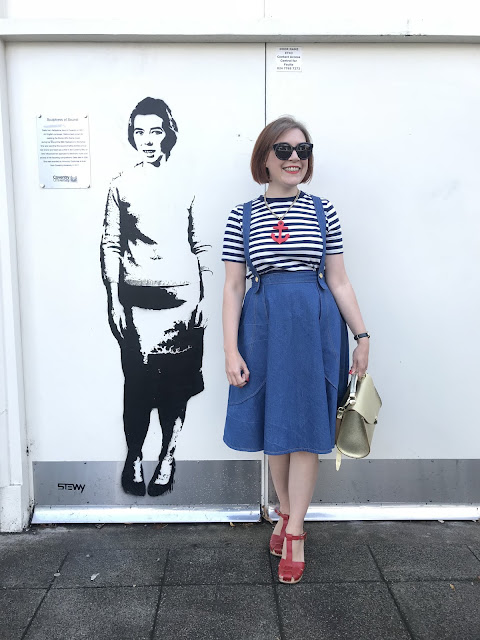 Victory Patterns Madeleine skirt, stripy top from Marks & Spencer, Tatty Devine necklace and Swedish Hasbeens heart sandals